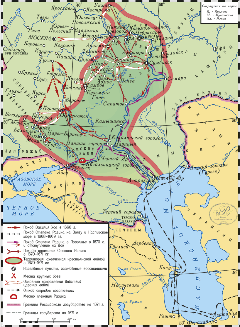 Мятеж перекинулся на исконно крестьянские области – Нижегородскую, Пензенскую, Тамбовскую, Воронежскую, Рязанскую. Идея о добром, но слабом царе, которого нужно освободить от злых бояр и жадных дьяков, была близка и понятна народному сознанию. В сохранившемся «прелестном письме» Разина читаем: «Пишет вам Степан Тимофеевич, всей черни. Хто хочет Богу да государю послужити, да и великому войску, да и Степану Тимофеевичу, и я выслал казаков, и вам заодно бы изменников вывадить и мирских кравапивцов вывадить. И мои казаки како промысь станут чинить и вам бы итить к ним в совет, и кабальныя и опальныя шли бы в полк к моим казакам».