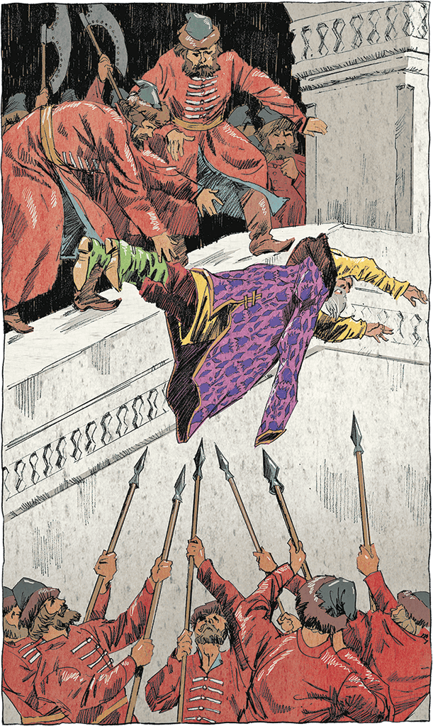 Стрельцы бросились вверх по ступеням. Матвеева, который пытался их остановить, тоже «изрубили в мелочь». Разбежались по коридорам и покоям в поисках «изменников». Список таковых был приготовлен заговорщиками заранее, и стрельцы знали, кого ищут: Нарышкиных, Языкова, воеводу Григория Ромодановского (за строгости военного времени) и еще нескольких своих недругов. Очевидец событий пишет: «А в царских хоромах по всем ходили невежливо с ружьем и искали бояр казнить». Под горячую руку, обознавшись, убили вместо Афанасия Нарышкина похожего на него стольника Салтыкова. Разобрались – пошли извиняться перед отцом. Тот ответил: «Божья воля» – и правильно сделал. Потому что когда стрельцы пришли к старому Долгорукому извиняться за убийство сына Михаила, начальник Стрелецкого приказа сказал вслед уходящим что-то злое. Бунтовщики вернулись, зарубили старика и швырнули труп в навозную кучу.