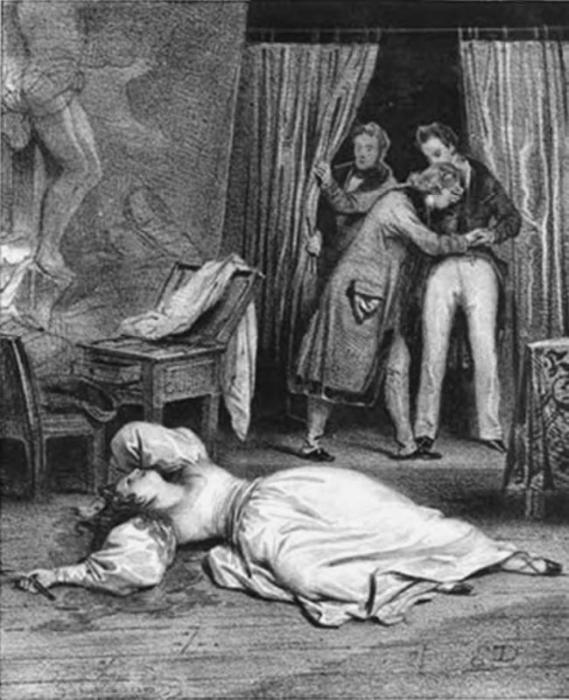 Они жили вместе много лет, не связывая себя брачными узами (ну, оба художники, понятно). А потом краса Констанс стала увядать. Бедная женщина смотрела в зеркало, рыдала и повторяла: «Я безобразна! Моя молодость ушла!» И в конце концов взяла да и перерезала себе горло бритвой.
