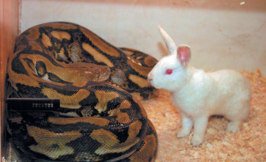 Вечером охранники запускали в стеклянный куб кролика, рептилия его кушала и потом целые сутки мирно спала.