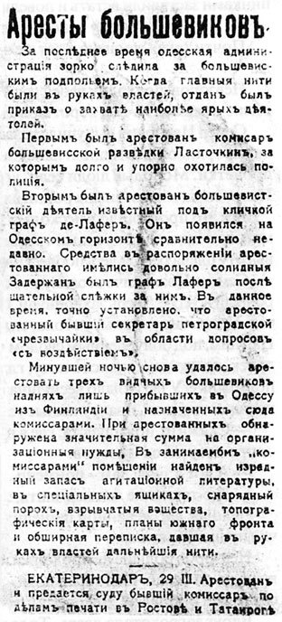 Тогда же я прочитал, что фамилия персонажа выдуманная, но человек был реальный. Некий юный чекист французского аристократического рода, чуть ли не маркиз, сыграл важную роль в освобождении Одессы от интервентов весной 1919 года. Время от времени я вспоминал о товарище маркизе и обещал себе, что обязательно его разъясню. Собрался только сейчас. Это оказалось нетрудно, слава Интернету.