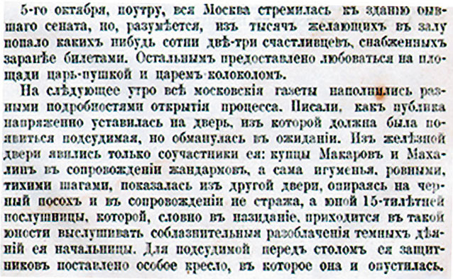 Знаменитый Федор Плевако, который защищал на процессе интересы жертв мошенничества, дотоптал игуменью в своей страстной речи, вдохновившей потом Островского написать пьесу «Волки и овцы», где Митрофания выведена под именем хищницы и мерзавки Мурзавецкой: «Овечья шкура на волке не должна ослеплять вас. Я не верю, чтобы люди серьезно думали о Боге и добре, совершая грабительства и подлоги». (Хм, а я верю.)