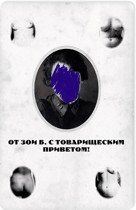 Это и была открытка, только самодельная. Но сделана хорошо, почти как типографская. Посередине в овальчике сама Баландян, а вокруг голые женские туловища, без голов – три передом, одно задом. И надпись: «От Зои Б. с товарищеским приветом!»