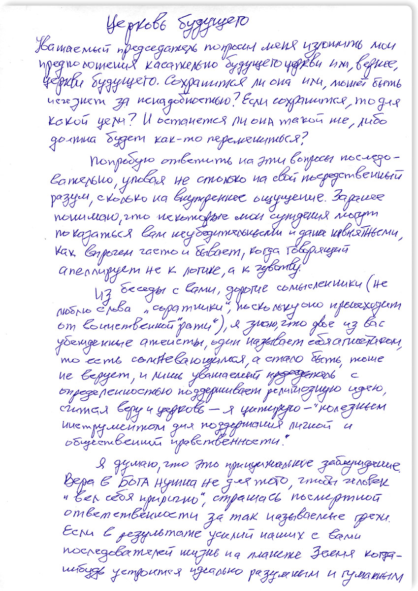 Уважаемый председатель попросил меня изложить мои предположения касательно будущего церкви или, вернее, церкви будущего. Сохранится ли она или, может быть, исчезнет за ненадобностью? Если сохранится, то для какой цели? И останется ли она такой же, либо должна будет как-то перемениться?
