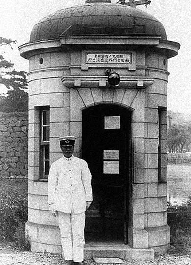 Полицейский позднего периода эпохи Мейдзи у своего кобана в Токио