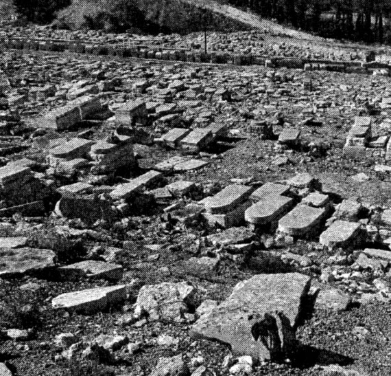 В верхней своей части кладбище напоминает раскоп какого-нибудь древнего города, от которого остались лишь контуры стен и фундаментов, изъязвленные временем. Вокруг каменные осколки, куски плит, просто груды щебня, поодаль шныряют костлявые, деловитые дворняги.