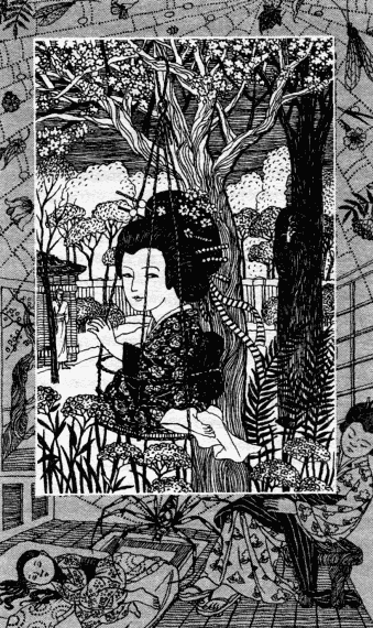 На суку старой узловатой яблони висела плетеная торба, в которой, слегка покачиваясь, сидела Эми Тэрада и смотрела на коллежского асессора широко раскрытыми, мерцающими глазами.