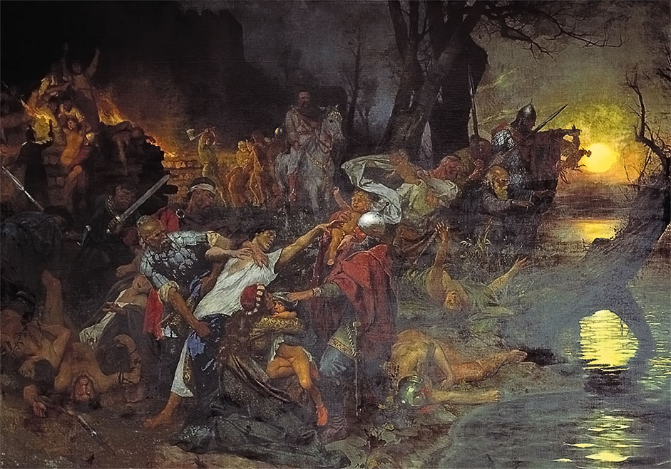 Увидев, сколь многочисленны враги, дружина приходит в ужас, и Святослав воодушевляет ее очередной речью: «Нам некуда уже деться, хотим мы или не хотим – должны сражаться. Так не посрамим земли Русской, но ляжем здесь костьми, ибо мертвым не ведом позор. Если же побежим – позор нам будет. Так не побежим же, но станем крепко, а я пойду впереди вас: если моя голова ляжет, то о своих сами позаботьтесь». В последующие века эту хрестоматийную орацию на Руси цитировали чуть не перед каждым сражением, а слова «мертвые сраму не имут» стали у нас главной военной максимой.