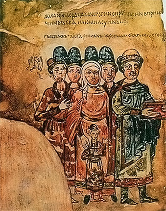На миниатюре из «Изборника» одиннадцатого века изображен великий князь Святослав Ярославич с семьей.