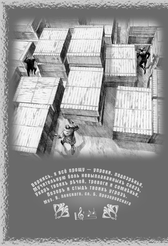 Погоня в кромешной тьме, среди запакованных роялей, – занятие малоприятное. Началось с того, что прапорщик неверно рассчитал направление и не сразу нашел проход. Потерял несколько бесценных мгновений, шаря рукой по шершавой поверхности.