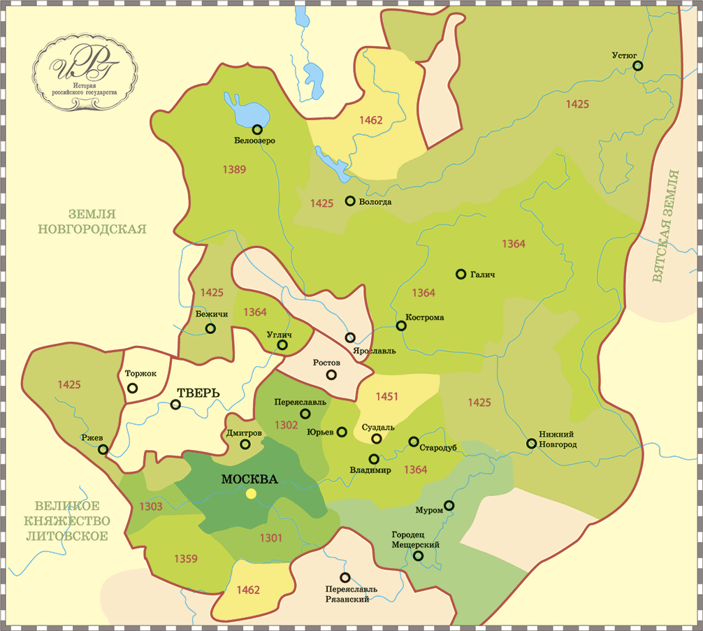 Территория княжества до Калиты была намного меньше современной Московской области, всего с четырьмя маленькими городами (еще Можайск, Коломна и Звенигород). В раннем завещании Ивана Даниловича (от 1327 года) городков уже семь – прибавились Серпухов, Радонеж и Руза. Потом Калита прикупил Белозерск, Углич и Галич Мерьский с уездами (хотя в последнем еще некоторое время сохранялись местные князья).