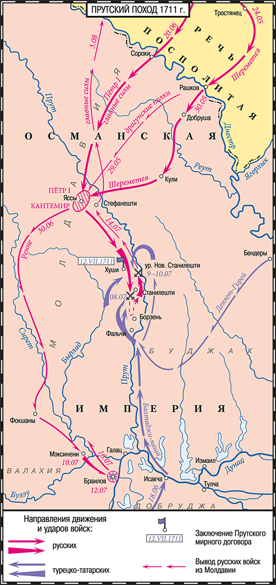 Если до полтавской победы Петру недоставало веры в свои силы, то к исходу следующего года царь впал в другую крайность: ему стало казаться, что он всемогущ и навсегда победоносен. Ничем иным кроме самоослепления нельзя объяснить рискованный шаг, на который царь решился осенью триумфального 1710 года. Прежде так опасавшийся войны на два фронта, потративший огромные суммы на Воронежский флот единственно из-за турецкой угрозы, теперь Петр сам пошел на обострение отношений с Константинополем.