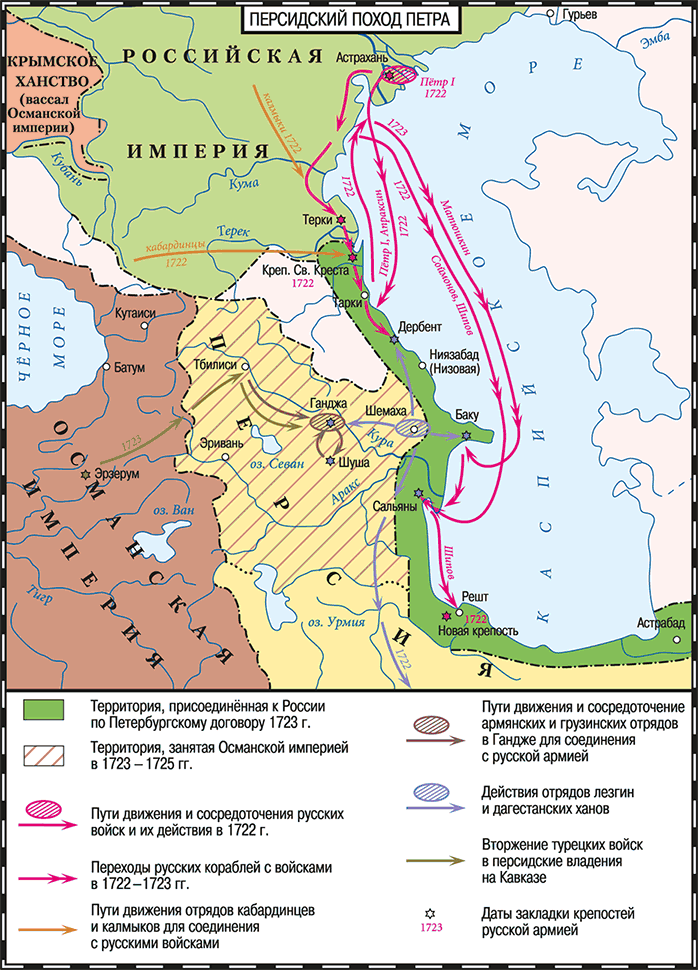 Персии в ее плачевном состоянии было не до защиты своих провинций. Новый шах Тахмасп, потерявший столицу, отчаянно нуждался в помощи. Его посланец в сентябре 1723 года заключил в Петербурге договор: Петр поможет союзнику войсками, а за это вся каспийская прибрежная полоса от Тарки до Астрабада переходит в российское подданство.