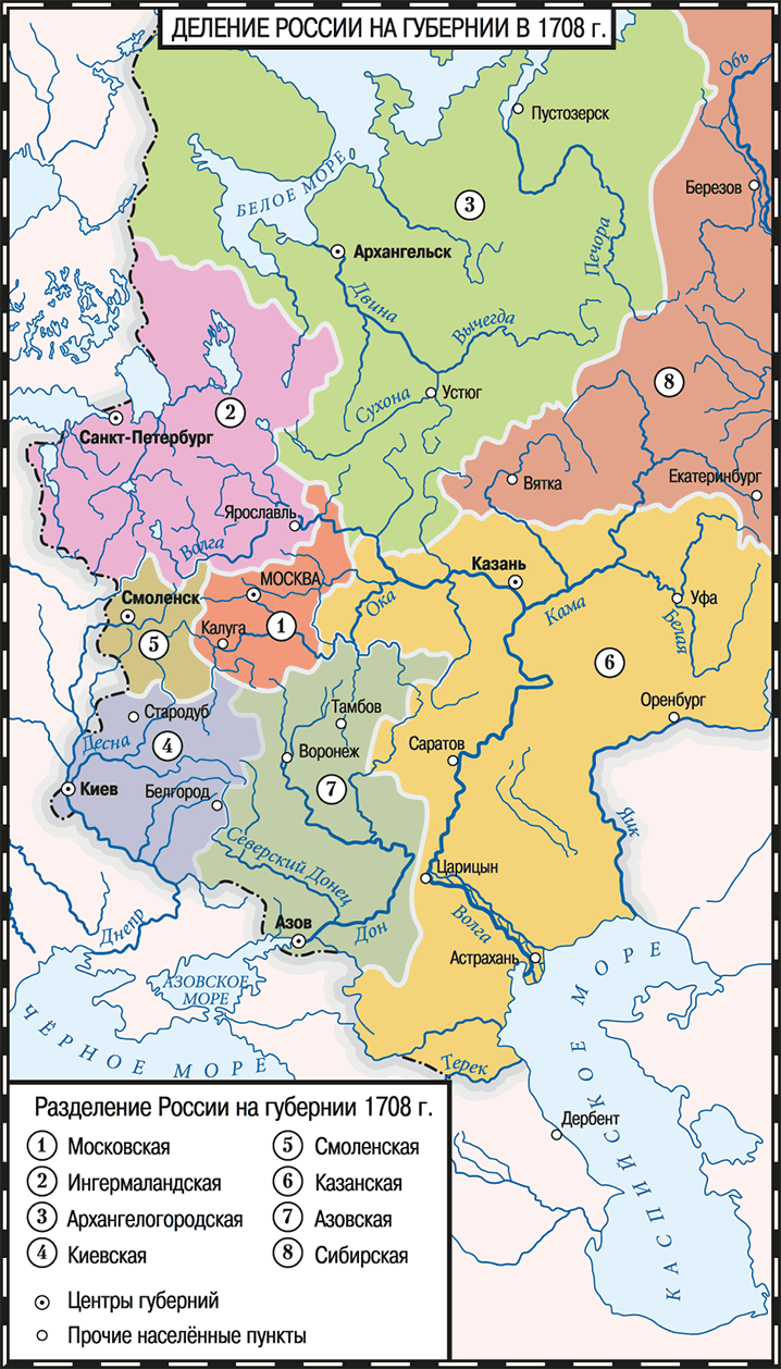 18 декабря 1708 появился указ – как обычно у Петра, написанный наспех и оттого невнятный – о какой-то «новой росписи городов». Россию поделили на восемь «губерний» (новое непонятное слово буквально означало «управление»): Московскую, Ингерманландскую, Киевскую, Смоленскую, Архангельскую, Казанскую, Сибирскую и Азовскую. Нагрузка по наполнению бюджета и содержанию вооруженных сил была разделена на восемь частей – что, собственно, и было основной целью затеи.