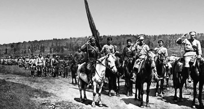 Впереди медленным шагом под свернутым знаменем ехали всадники, человек десять-пятнадцать.