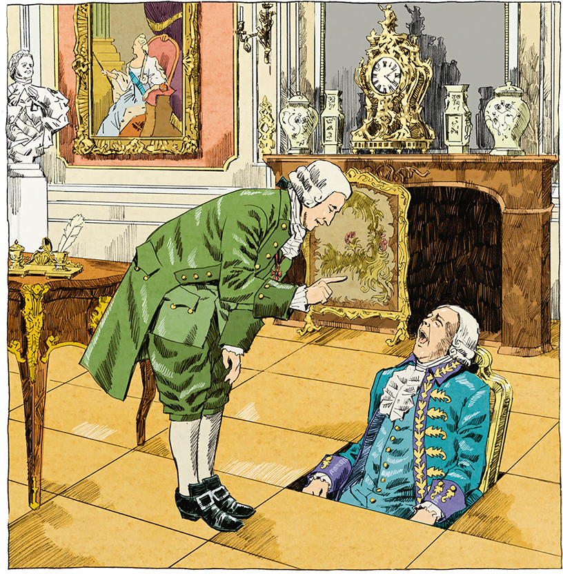 Со знатными особами, чем-то провинившимися перед государыней (главным образом из-за длинного языка) Шишковский вел себя еще затейнее, чем с бунтовщиком. Рассказывают, что у него в кабинете имелось какое-то хитрое кресло, которое до половины опускалось под пол, и палач сек виновного (или виновную) плетью, пока Степан Иванович произносил нравоучение. Дворянское достоинство при этом не страдало, поскольку палач не знал, кому принадлежит секомая часть тела, а Шишковский экзекуции вроде бы и не видел.