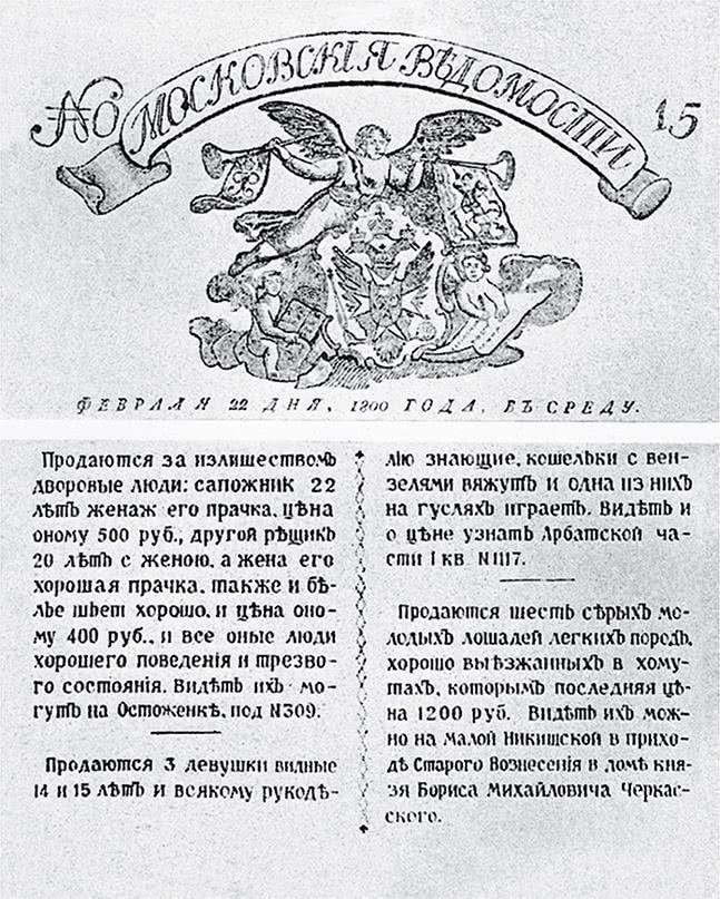 Обычной практикой стала продажа крепостных как любой другой собственности, в том числе и без земли – «на вывоз». Официально эта практика осуждалась, но газеты были полны объявлений о продаже людей, причем цена все время возрастала – товар пользовался высоким спросом. В начале царствования средняя стоимость «души» с землей составляла тридцать рублей, в конце – не меньше ста. Цена на слуг, в зависимости от их здоровья и умений, могла быть как много ниже, так и много выше – точно так же, как по-разному стоили рысак и простая кляча.
