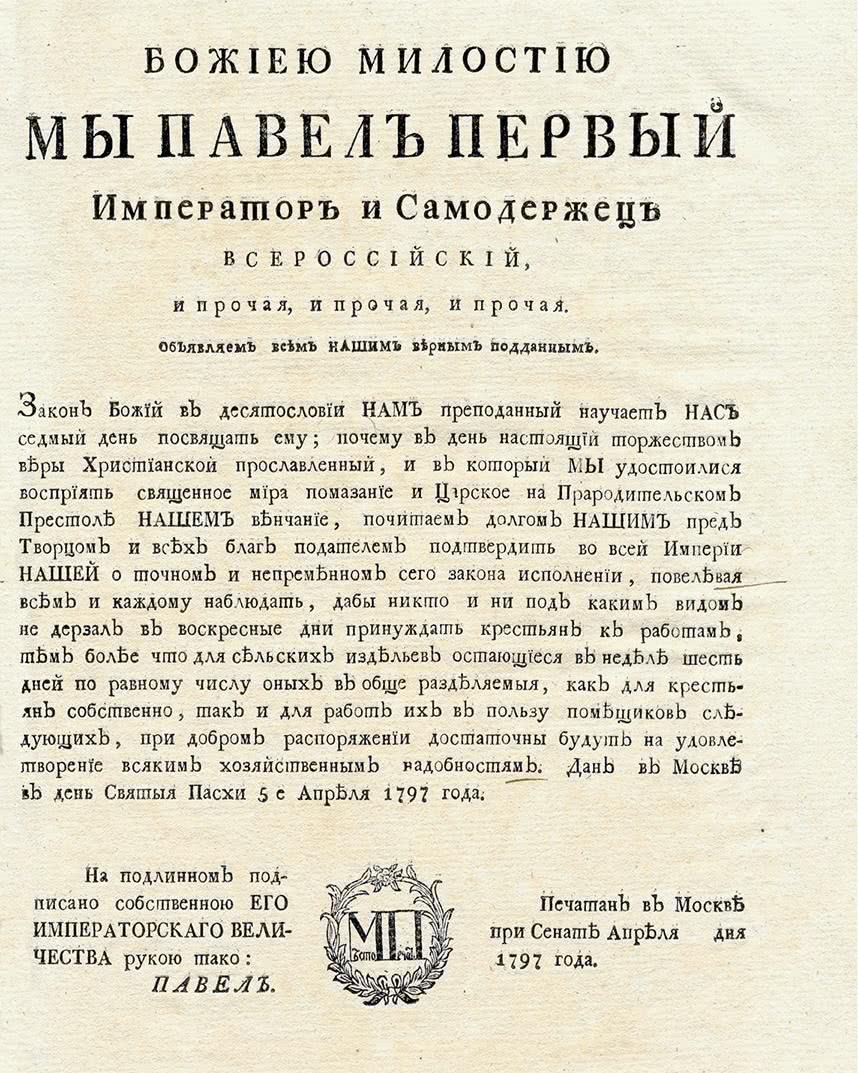 На Пасху 1797 года Павел сделал помещичьим крестьянам главный подарок: издал указ, ограничивавший барщину тремя днями в неделю, да еще за вычетом церковных праздников, которых набиралось несколько десятков в год.