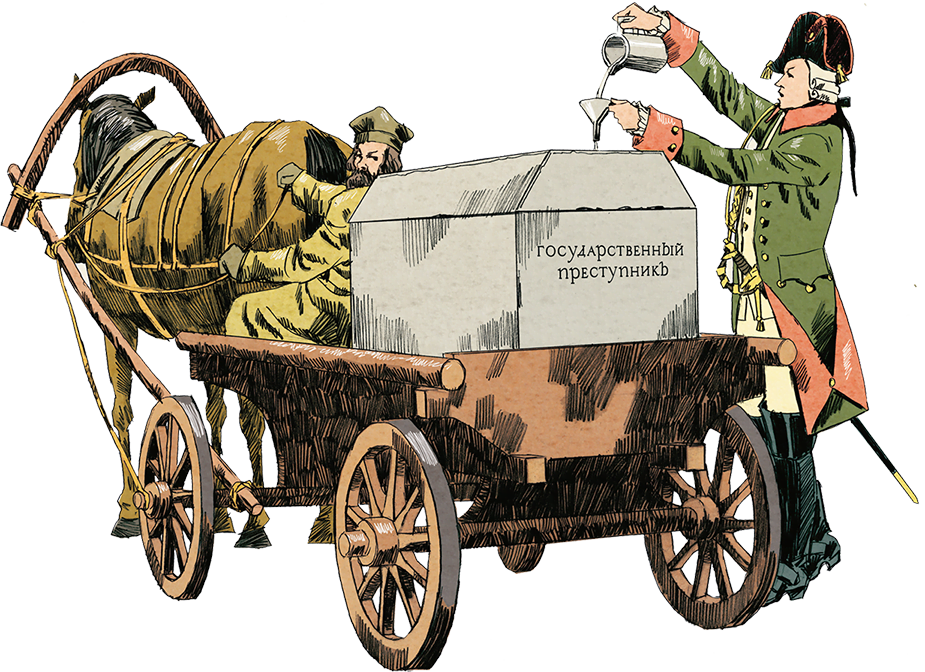Положим, инцидент с Грузиновыми был случаем исключительным, но жестокость обращения с арестантами и осужденными в эту эпоху становится нормой. Например, при Павле практиковался особый порядок этапирования государственных преступников (а в этот разряд кто только не попадал). Узника лежьмя «запечатывали» в крошечную гробообразную кибитку с маленьким отверстием для передачи пищи и так везли к месту дальнего заключения – иногда по нескольку месяцев. Многих, естественно, не довозили. Павел подобных садистских инструкций никому не давал. Он всего лишь приказывал, чтобы имя и лицо узника скрывались даже от конвоя, а остальное уже придумывали старательные служаки.