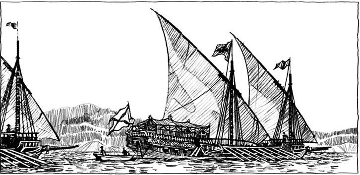 Сначала по широкой реке раскатился гуд литавр, вслед за которым вновь грянул пушечный салют: на сей раз первыми начали корабельные орудия, им вторили береговые. От царской галеры двинулась раззолоченная ладья под пурпурным балдахином, резво шевеля веслами, будто деловитая сороконожка. За ней, почтительно приотстав, плыли шлюпки поменьше.