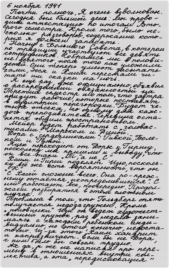 Почти полночь. Я очень взволнован. Сегодня был большой день: мы проводили аттестацию по итогам Второго семестра. Кроме того, было несколько разговоров, содержание которых я должен записать.