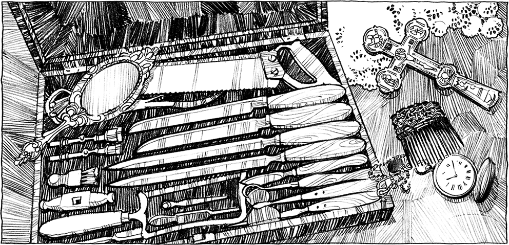 Потом Женкин начал дарить привезенные из плаваний подарки, никого не обошел. Отец Мирокль получил перламутровое распятье – правда, католическое, но моряк в подобных нюансах не разбирался, ему все исповедания кроме родного англиканского были едины. Попадье достался чудесный черепаховый гребень. Ради такого случая Виринея спустила на плечи платок, явив всем свои прекрасные черные волосы, но тут же снова покрыла голову. Платон Иванович обрел серебряные часы на цепочке и, хоть теперь носил в кармане золотые, все равно умилился и прослезился. Своей любимице Александре путешественник привез набор хирургических инструментов – откуда ему было знать, что дева поглупела и больше обрадовалась бы черепаховому гребню. Медный ящичек открыла Виринея, стала с интересом перебирать ножички, хитрые крючки, пилки. Пока Фома Фомич доставал из вояжного сака следующий дар, произошел обмен: лекарский прибор перешел к попадье, гребень – к барышне, и та немедленно принялась рассматривать себя в зеркальце.