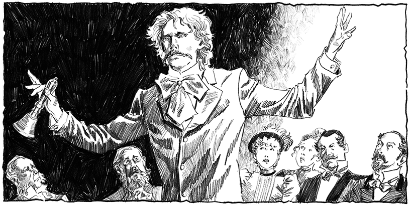 Помимо способностей сверхъестественных Дэниел Юм обладал еще и поразительным талантом к языкам. В Париже он выступал на французском, в Вене на немецком, в Риме на итальянском, и по-русски говорил совершенно правильно, с легким, чарующим акцентом. Оно, впрочем, неудивительно. Прославленный ясновидец часто бывал в России и давно с нею сроднился. Его первая жена была русская. Когда она, сраженная злым роком, умерла молодой, Юм женился снова, и опять на русской барышне, которая не побоялась подвергнуть себя смертельной опасности. Его избраннице в Петербурге одни сочувствовали, другие завидовали.