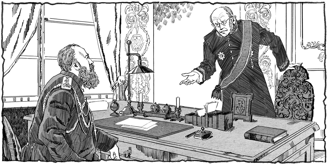 Император всё больше нервничал. Ход заседания ему не нравился. Он с тревогой посматривал на Победоносцева, но тот сидел вялый, тускло глядел на поверхность стола. Тогда царь обратился к Игнатьеву, зная, что тот всегда был за жесткое подавление всяческого вольномыслия.