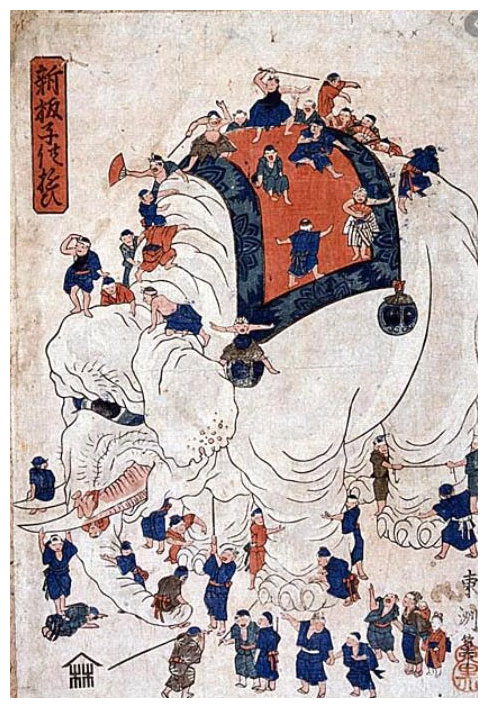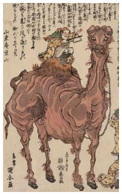 Кава-бута («речная свинья») – это африканский бегемот. Экзотических животных в Японии представляли себе главным образом по рассказам голландцев. Изредка те привозили в дар сёгуну какого-нибудь тигренка, слоненка или верблюда, но те надолго не заживались. Бегемотов японцы уж точно никогда не видели.