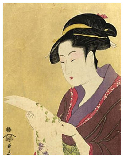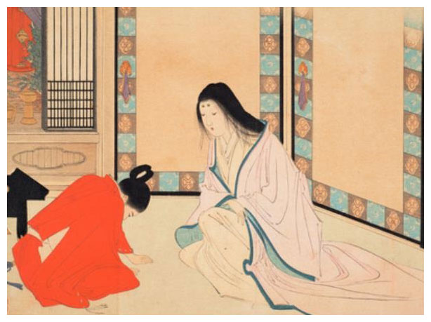 Фрейлина Наноха, изображенная на этой картине беседующей со своим пажом, не жила в эпоху Хэйан (VIII–XII в.в.), не писала возвышенных стихов о любви и вообще является плодом воображения автора.