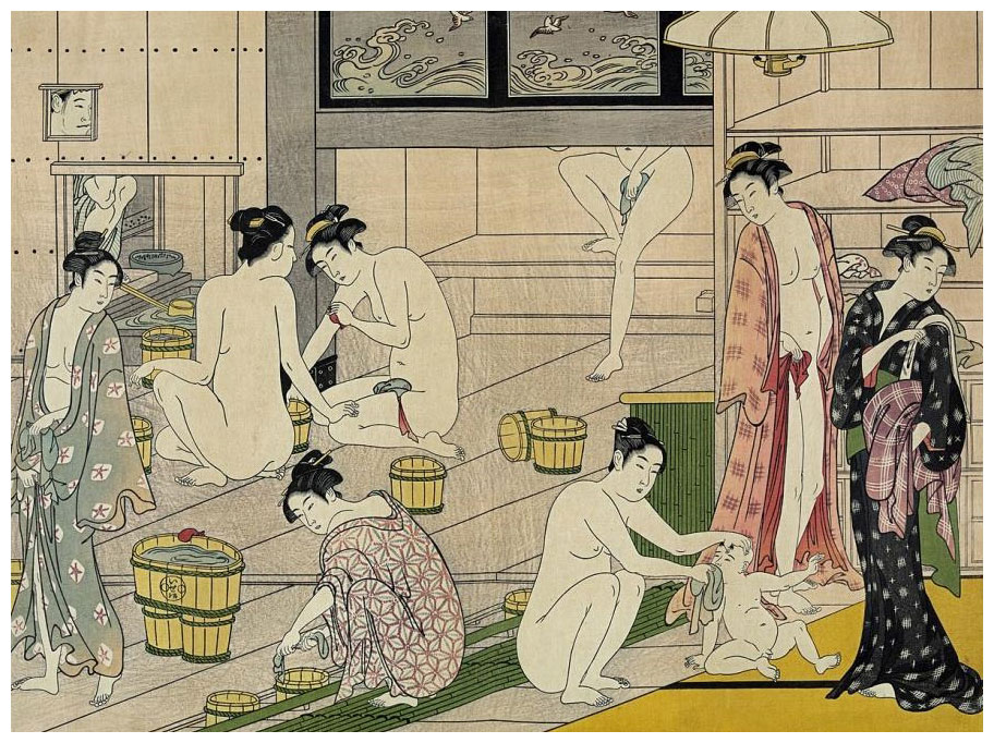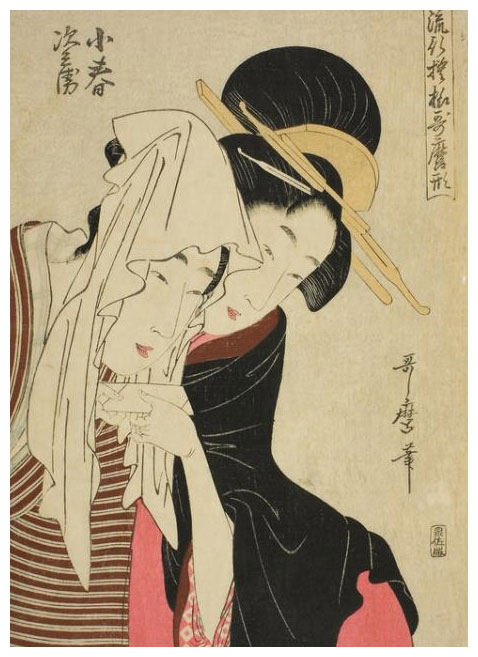 Квинтэссенция Текучего Мира: льющаяся вода, бренная красота, игривость (внимание на левую верхнюю часть картины). Тории Киёнага.