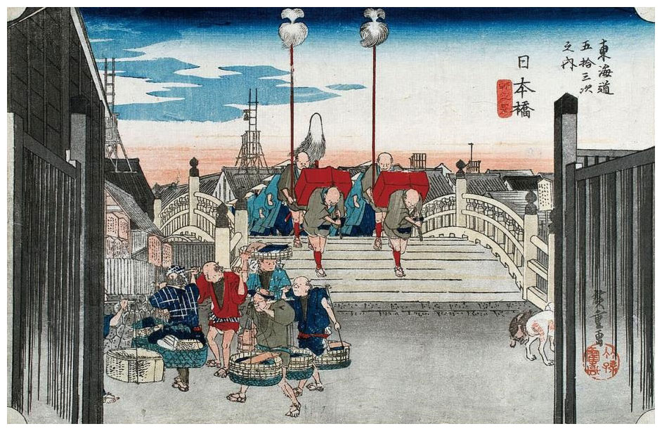 Мост Нихонбаси (Японский Мост) через реку Сумида был самым оживленным пунктом столицы. От этой точки велся отсчет расстояний. Если говорили, что такой-то город находится в стольких-то ри от Эдо, имелся в виду мост Нихонбаси.
