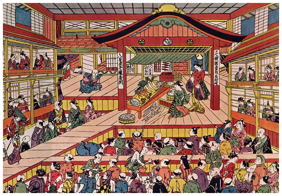 Слева на ханамити переодетый женщиной актер исполняет митиюки.