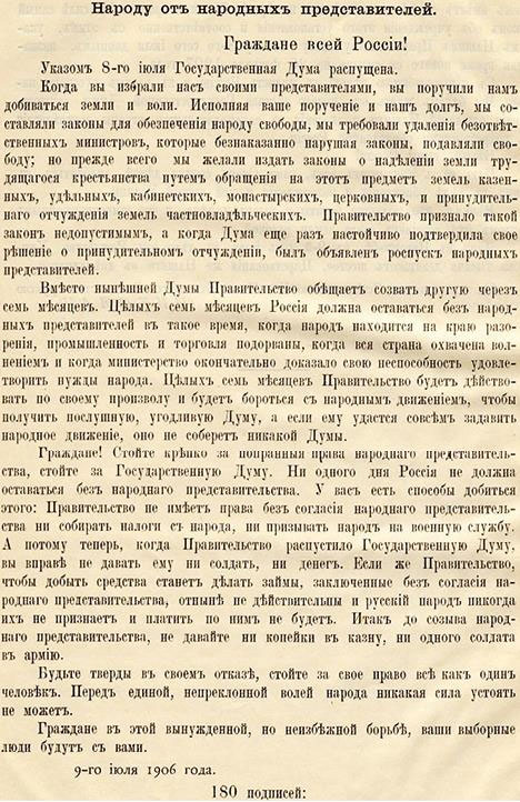 В апреле открылась Дума, сразу же взяв курс на конфронтацию с правительством. Тогда же активный, но ненадежный Витте был заменен надежным, но вялым Горемыкиным. В начале июля кабинет возглавил и активный, и надежный Столыпин. Он тут же распустил неуправляемый парламент, который своим фрондированием постоянно дестабилизировал и без того напряженную обстановку в стране. Новая дума должна была собраться только через несколько месяцев, что давало премьер-министру время подавить беспорядки полицейскими методами. Часть депутатов не подчинилась указу и провозгласила в Выборге кампанию гражданского неповиновения, но широкой поддержки это воззвание не нашло.