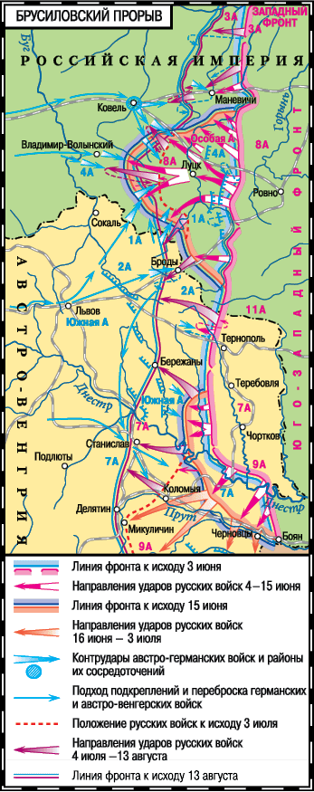 «Брусиловский прорыв» продолжался два с половиной месяца. Русские войска продвинулись на широком фронте, местами более чем на 100 километров вглубь. Австро-венгерская армия только пленными потеряла 400 тысяч человек, а в общей сложности около миллиона. Но столько же людей потеряли и русские – наступление всегда сопряжено с большими жертвами. Юго-Западный фронт остановился, потому что войска были обескровлены.