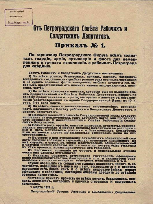 Петроградский совет по собственному почину берет командование над войсками округа и выпускает «Приказ № 1», адресованный всей российской армии. Там объявляется, что воинские части должны «немедленно выбрать комитеты из выборных представителей от нижних чинов». Солдатские комитеты фактически упраздняли систему единоначалия, без которого армия становится трудноуправляемой. Не доверяя генералам и офицерам, революционный орган подорвал военную дисциплину и обрек вооруженные силы страны на разложение. С этого момента начинается развал Восточного фронта.