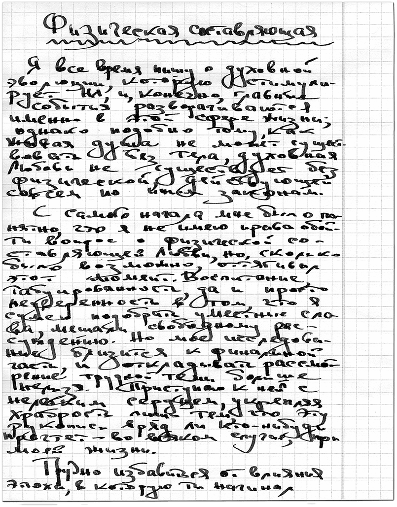 С самого начала мне было понятно, что я не имею права обойти вопрос о физической составляющей Любви, но, сколько было возможно, оттягивал этот момент. Воспитание, табуированность, да и просто неуверенность в том, что я сумею подобрать уместные слова, мешали свободному рассуждению. Но мое исследование близится к финальной части, и откладывать рассмотрение трудной темы больше нельзя. Приступаю к ней с нелегким сердцем, укрепляя храбрость лишь тем, что эту рукопись вряд ли кто-нибудь прочтет – во всяком случае, при моей жизни.