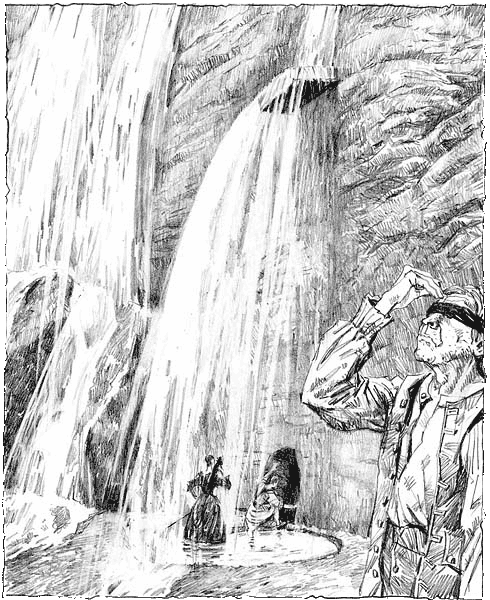 Несколько шагов, и Логан с Летицией оказались под сумрачным сводом. Гарри сдвинул какой-то рычаг, наверху снова заскрежетало. В ту же минуту мы оказались в почти полной темноте. Козырек опустился, водопад встал на место. От внешнего мира нас отгораживала подвижная, шумная завеса воды. Удивительное зрелище! Все вокруг черным-черно, и лишь с одной стороны – живое пятно тусклого красно-коричневого света.