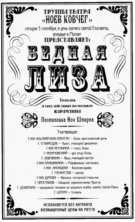 Карамзинскую повесть, считающуюся шедевром сентиментализма, Эраст Петрович очень не любил, на что у него были личные, весьма серьезные основания, не имеющие отношения к литературе. Еще болезненней было прочесть, что спектакль посвящен «памяти святой Елисаветы».
