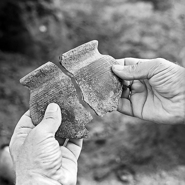 Осколки керамического сосуда, найденные при археологических раскопках в древнерусском городе Звенигороде-Галицком