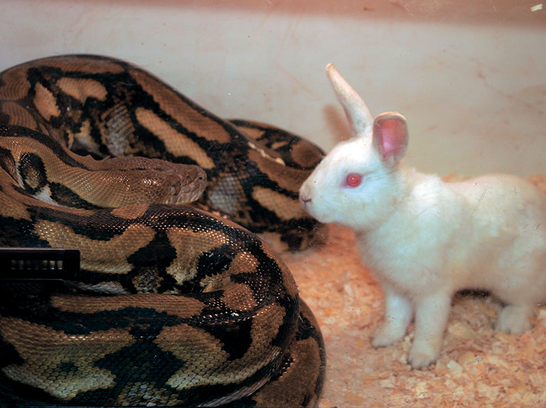Они поведали, что на сей раз «ужин удава» повел себя нетипичным образом. Отказался гипнотизироваться, а вместо этого сам начал наскакивать на змеюку. Не привыкшая к сопротивлению, она ужасно удивилась и напугалась. Забилась в угол. Совсем расхотела кушать.