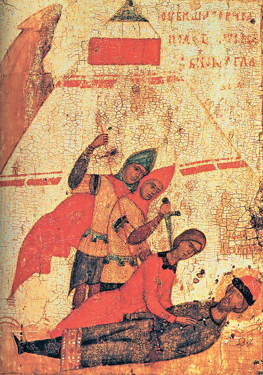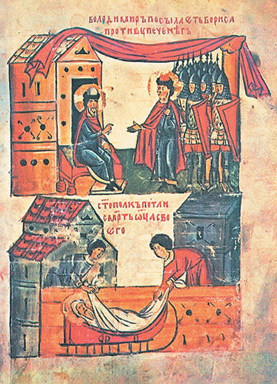 Блаженного же Бориса, обернув в шатер, положили на телегу и повезли. И когда ехали бором, начал приподнимать он святую голову свою. Узнав об этом, Святополк послал двух варягов, и те пронзили Бориса мечом в сердце. И так скончался, восприняв неувядаемый венец. И, принесши тело его, положили в Вышгороде и погребли в земле у церкви святого Василия.