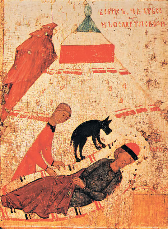 И вдруг увидел устремившихся к шатру, блеск оружия, обнаженные мечи. И без жалости пронзено было честное и многомилостивое тело святого и блаженного Христова страстотерпца Бориса. Поразили его копьями окаянные Путьша, Талец, Елович, Ляшко.