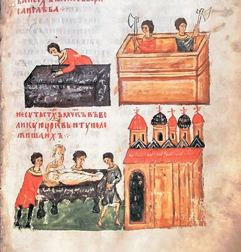 Строительство Борисоглебского храма в Вышгороде и перенесение мощей в новый храм. Миниатюра «Сказания о Борисе и Глебе» из Сильвестровского сборника. XIV в.