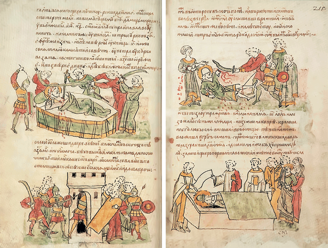 Лишь настала ночь, прибежав и схвативши оружие, пошли на князя, как дикие звери, но, пока они шли к его спальне, пронзил их и страх, и трепет. И бежали с крыльца, спустясь в погреба, упились вином. Сатана возбуждал их в погребе и, служа им незримо, помогал укрепиться в том, что они обещали ему. И так, упившись вином, взошли они на крыльцо. Главарем же убийц был Петр, зять Кучки, Анбал, яс родом, ключник, да Яким, да Кучковичи – всего числом двадцать зловредных убийц, вошедших в греховный сговор в тот день у Петра, у Кучкова зятя, когда настала субботняя ночь на память святых апостолов Петра и Павла.