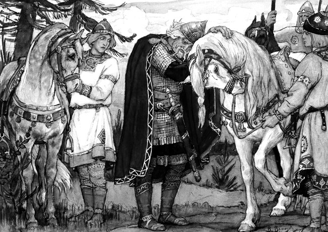 Волхвы предсказали Олегу смерть от любимого коня. Олег расстался с верным боевым другом, но приказал кормить его. Прошло несколько лет, за это время князь ни разу не приближался к тому коню. Тридцать лет и три года правил Олег в Киеве. Однажды осенью он вспомнил про любимого коня, вспомнил и предсказание волхвов. Олег позвал главного конюха: «Где конь мой, которого я приказал кормить и беречь?» – «Умер твой конь, князь». Олег посмеялся: снова он оказался проницательнее волхвов! И захотел посмотреть на череп и кости любимого коня. «От этого ли коня смерть мне принять?» – воскликнул князь, наступив на череп ногой. Тут из черепа выползла змея и укусила Олега. Несколько дней князь пролежал в лихорадке и умер. Есть версия, что ядовитую змею Олегу подбросили византийцы. Укус киевской гадюки вряд ли может оказаться смертельным, а у греков был давний счёт к воинственному правителю Руси.