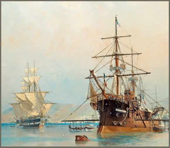 Мир вокруг поменялся до неузнаваемости образом. Берег стал ближе – теперь до него было не больше двухсот метров. Место серых округлых валунов, между которых пенился прибой, заняло нечто вроде волнолома, сооружённого из больших обтёсанных гранитных блоков, на нём – рыбаки с длинными удочками. За волноломом высится лес мачт, их вертикальные линии, перечёркнуты реями, окутаны лесенками вант и паутинками такелажа. Дальше видны красные черепичные крыши – город, порт? Словно на венецианских пейзажах Айвазовского, подумал Роман, видевший картины великого мариниста год назад в галерее, в Феодосии – и тут за спиной протяжно взревел гудок.