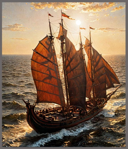 Следующего визитёра пришлось ждать больше часа. Роман уже решил, что в череде загадочных появлений наступил перерыв – возможно, предусмотренный неким графиком? – и полез в карман за шоколадным батончиком, которым он предусмотрительно запасся в судовом буфете. Потому и пропустил возникновение третьего вихря, а когда поднял глаза – в центре круга стояло самое необычное судно из всех, что он когда-либо наблюдал своими глазами, вживую. Подобную посудину – широкую, седловатую, с высоко задранными носом и кормой, и парой мачт, стоящих не одна за другой, а попарно, поперёк корпуса судна, он видел на экране телевизора, когда в прошлом году решил-таки посмотреть амазоновский сериал «Кольца власти». И паруса были такие же – перепончатые, как у китайских джонок, словно крылья то ли драконов, то ли гигантских летучих мышей…