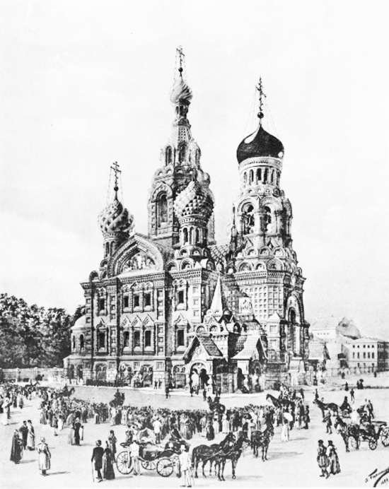 [Закрыть]. Собор Воскресения на 1600 молящихся играл роль мемориала Царя-Освободителя, осененного ореолом Царя-Мученика. Всеми средствами – архитектуры, живописи, настенных текстов – создатели храма стремились выразить эту тему.