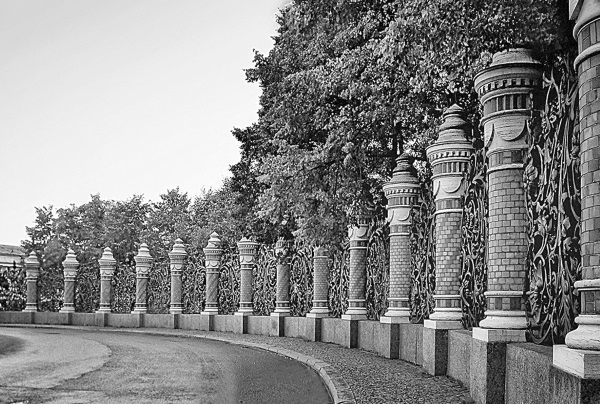Изысканный живописный рисунок решетки сплетается из упругих стеблей с крупными цветами и листьями. Они динамично скручиваются спиралями, тянутся вверх живыми извивами. Затейливые растительные узоры отчасти напоминают о древнерусских «травных росписях». В этом угадывается связь с убранством самого храма Воскресения Христова.